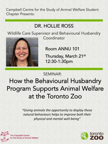 Dr. Hollie Ross, from the Toronto Zoo will be presenting her talk on "How the Behavioural Husbandry Program Supports Animal Welfare at the Toronto Zoo"